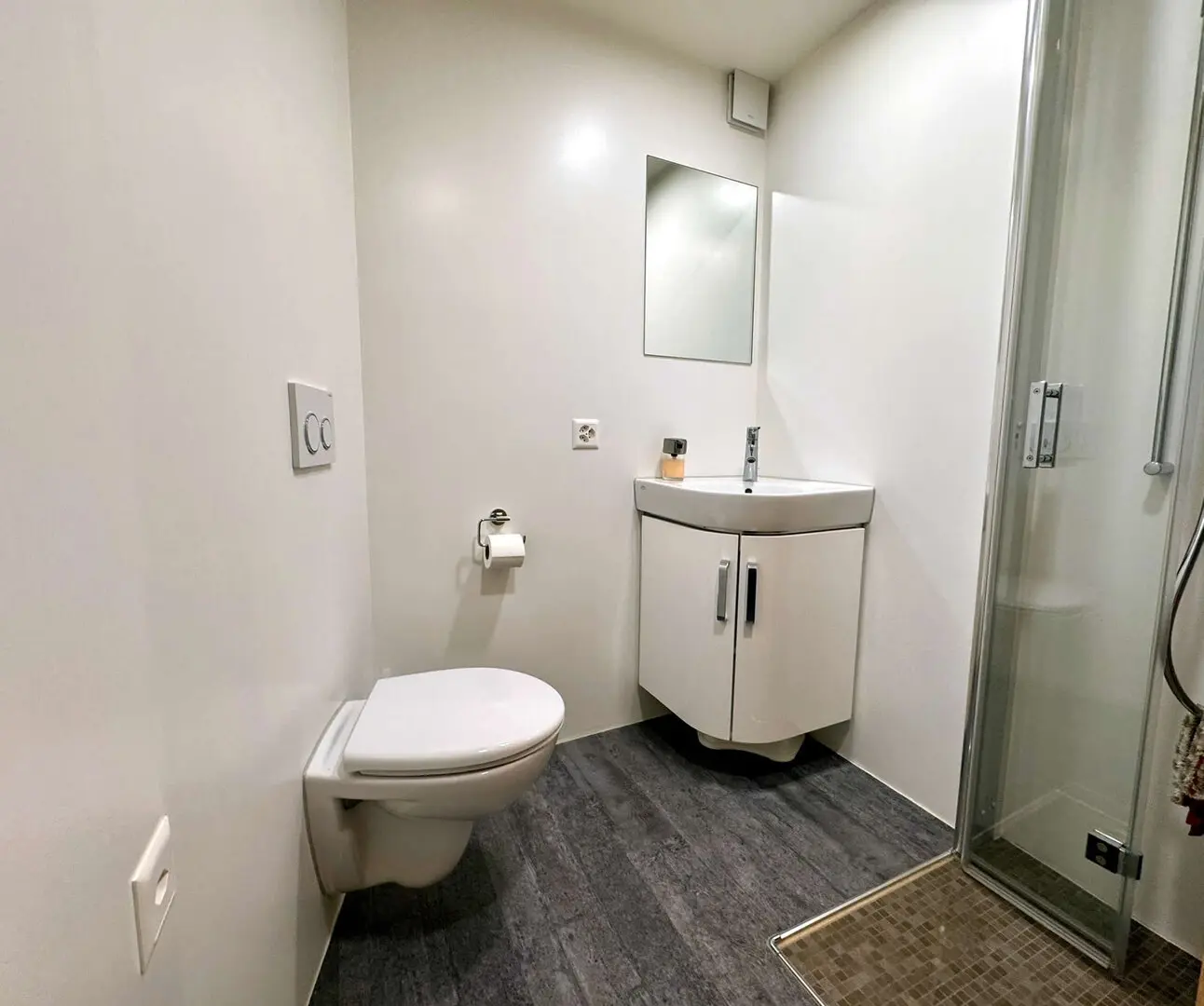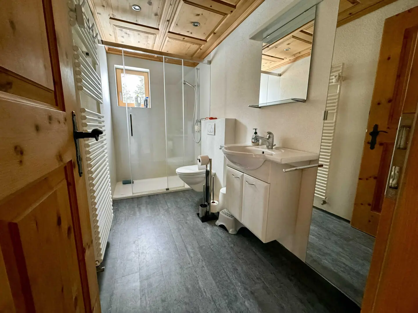 L’appartamento dispone di tre camere da letto: due camere con letto matrimoniale (180 × 200 cm e 200 × 200 cm) e una camera per bambini con letto a castello (2 × 90 × 190 cm). Questa disposizione è ideale per famiglie o coppie con un ospite aggiuntivo. Animali domestici sono benvenuti. L’alloggio è dotato di un bagno con doccia e WC e di una seconda doccia separata con WC, garantendo così un elevato comfort anche in presenza di più ospiti.