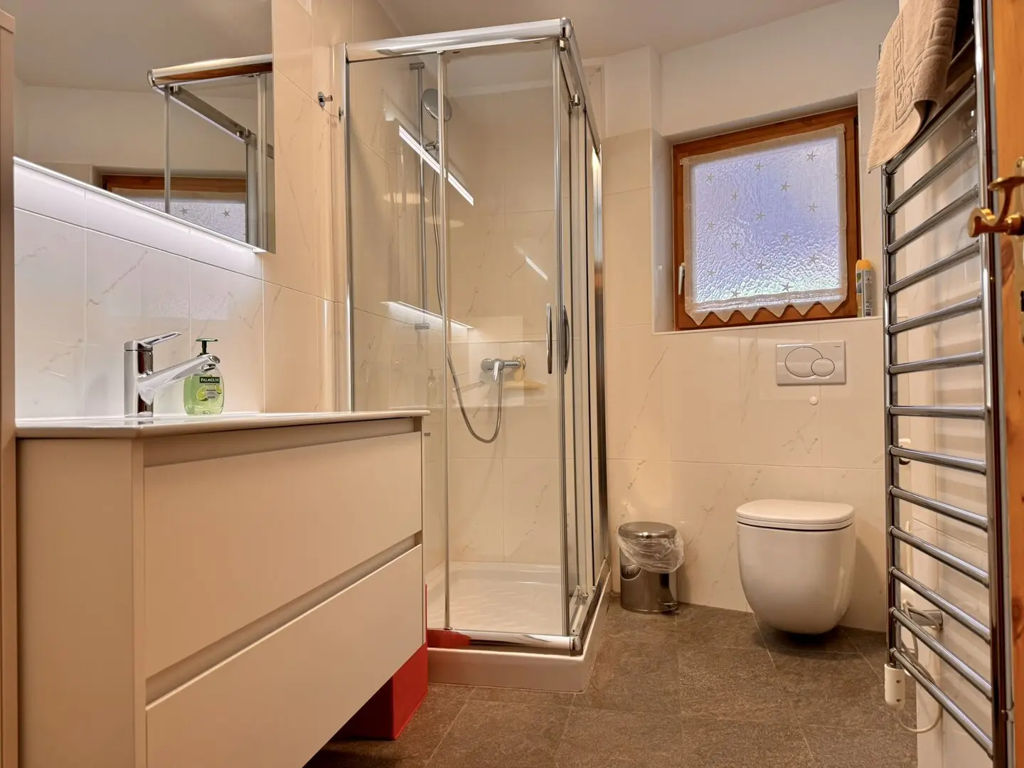 Il bagno è dotato di doccia e WC, e vi è anche un WC separato per un comfort ancora maggiore. La camera da letto principale è arredata con un comodo letto matrimoniale, mentre la seconda camera dispone di due letti singoli. Entrambe le camere offrono ampio spazio, e la seconda camera è dotata di un balcone privato con vista sul Piz Padella, ideale per trascorrere momenti di tranquillità.